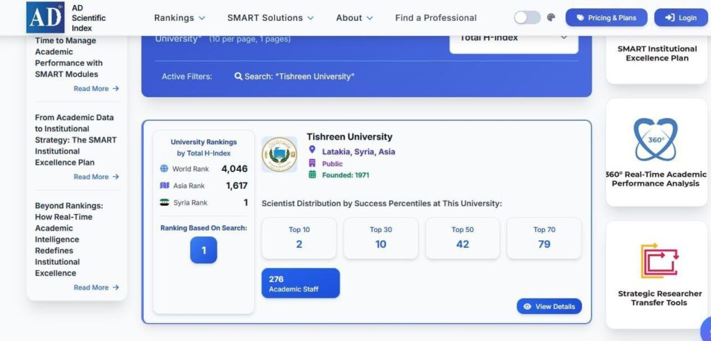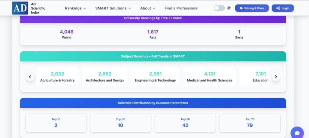 في إطار السعي الدائم نحو الارتقاء بالعلم وتطوير التعليم العالي في سوريا ونشر الكفاءات العلمية، حقّقت جامعة اللاذقية إنجازاً بارزاً بصدارتها قائمة الجامعات السورية في تصنيف AD Scientific Index للجامعات للعام 2026، الصادر في 17 شباط 2026، مع احتلالها المرتبة الأولى محليًا و6018 عالمياً حسب الأداء البحثي ومعامل h_index الذي يعكس جودة ونوعية الإنتاج العلمي للأعضاء الأكاديميين فيها.